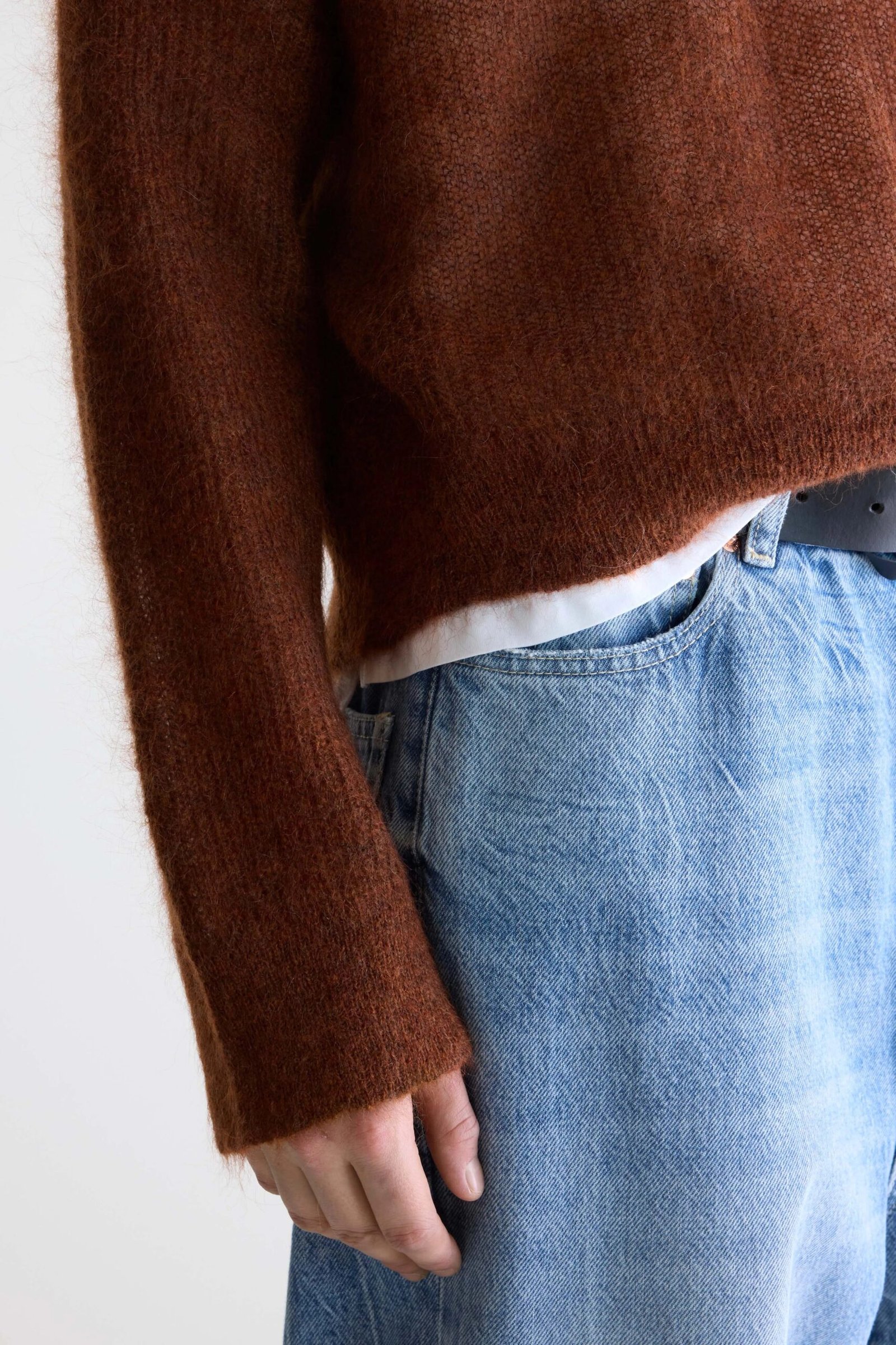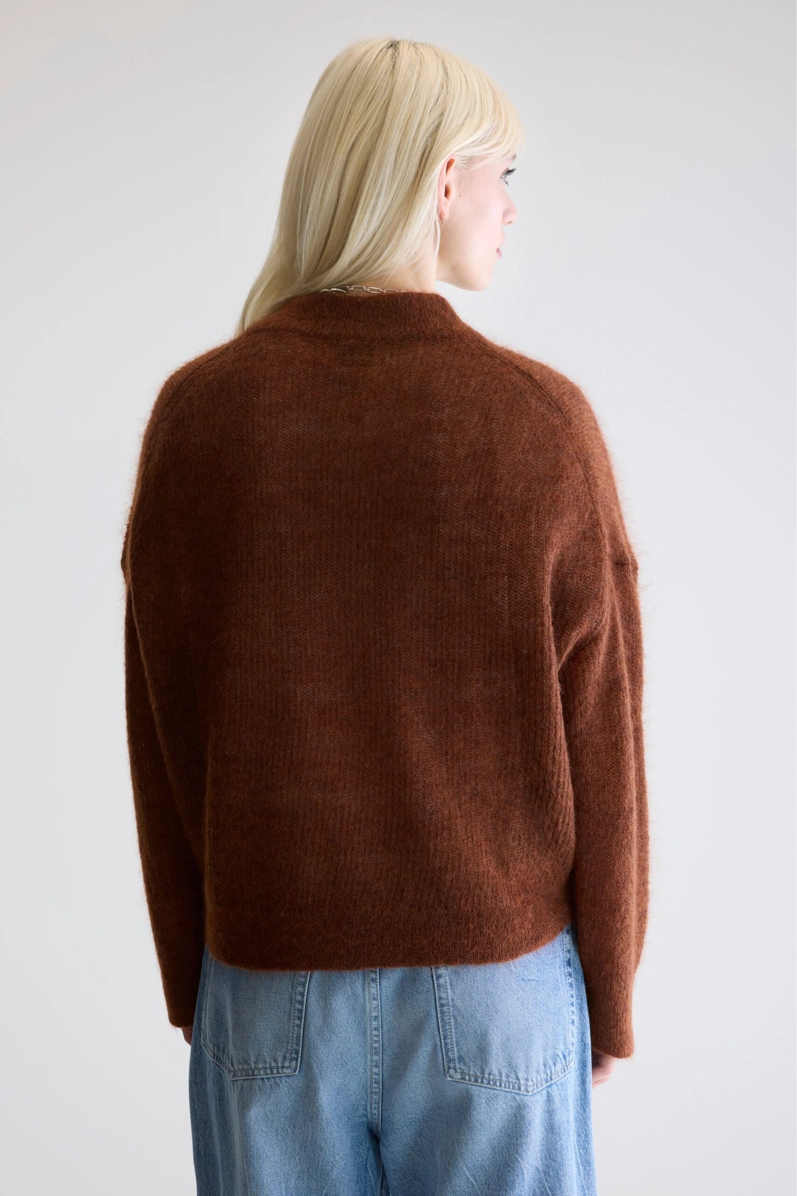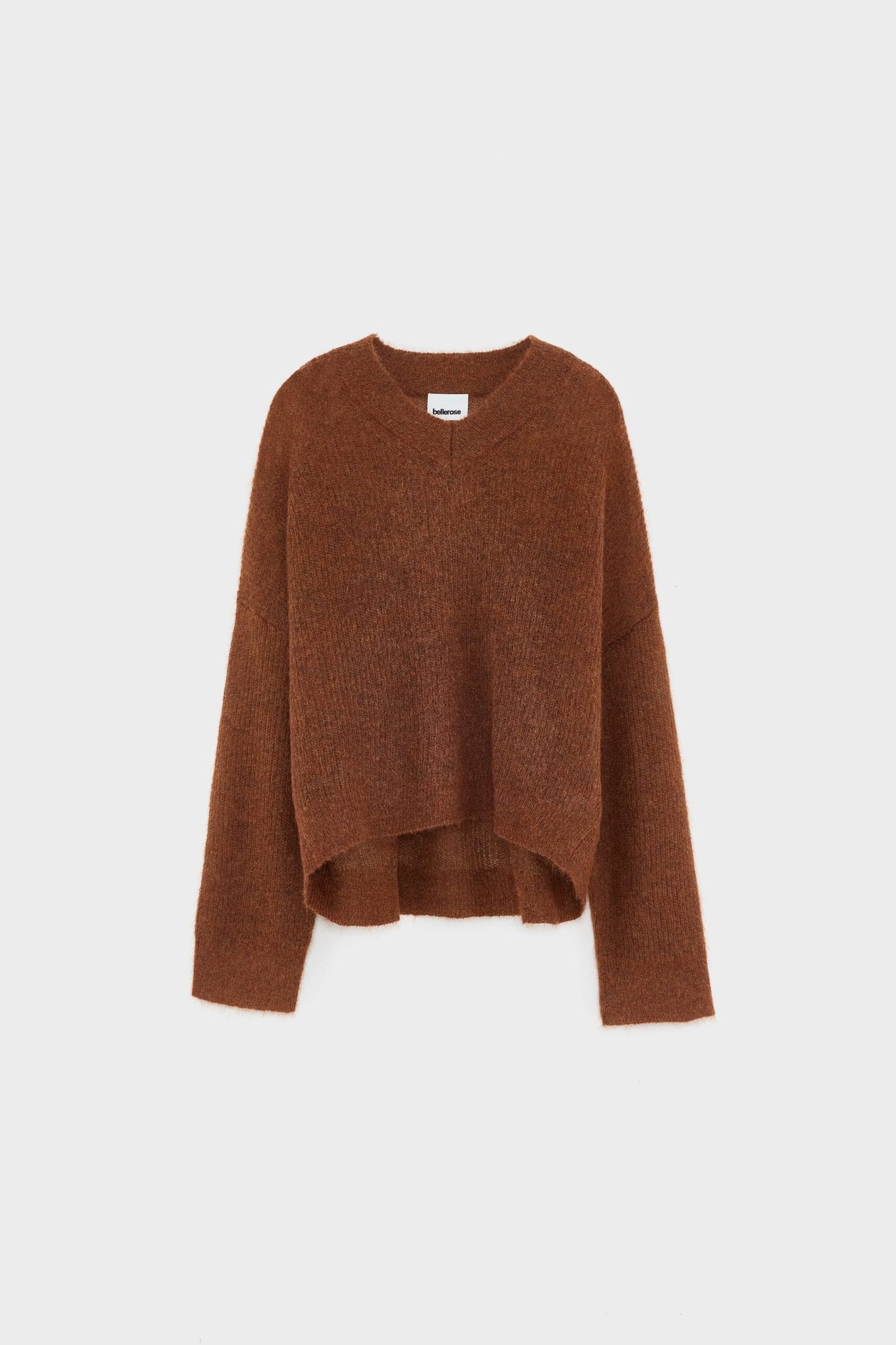 Oversized v-neck sweater with long sleeves and double knit collar. Crafted from a soft mohair blend in tan.