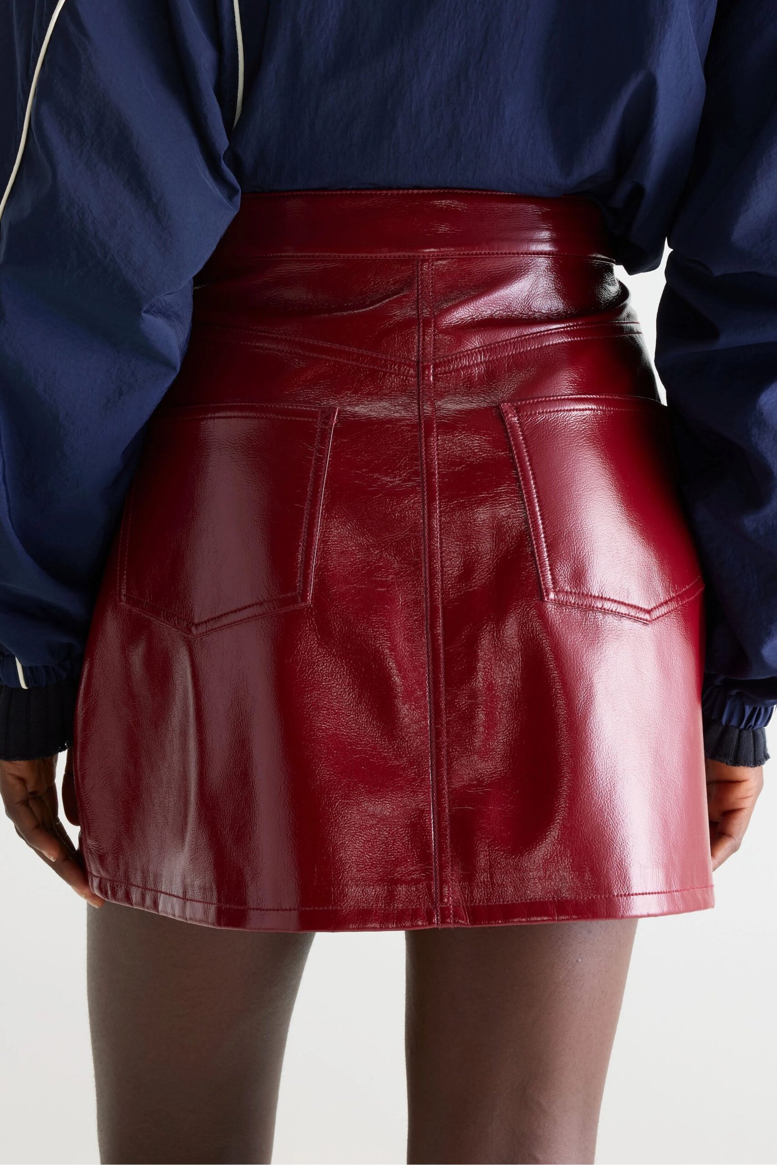 Faux-leather mini skirt with an A-line shape and 5-pocket style made from vinyl-like fabric in cherry red.