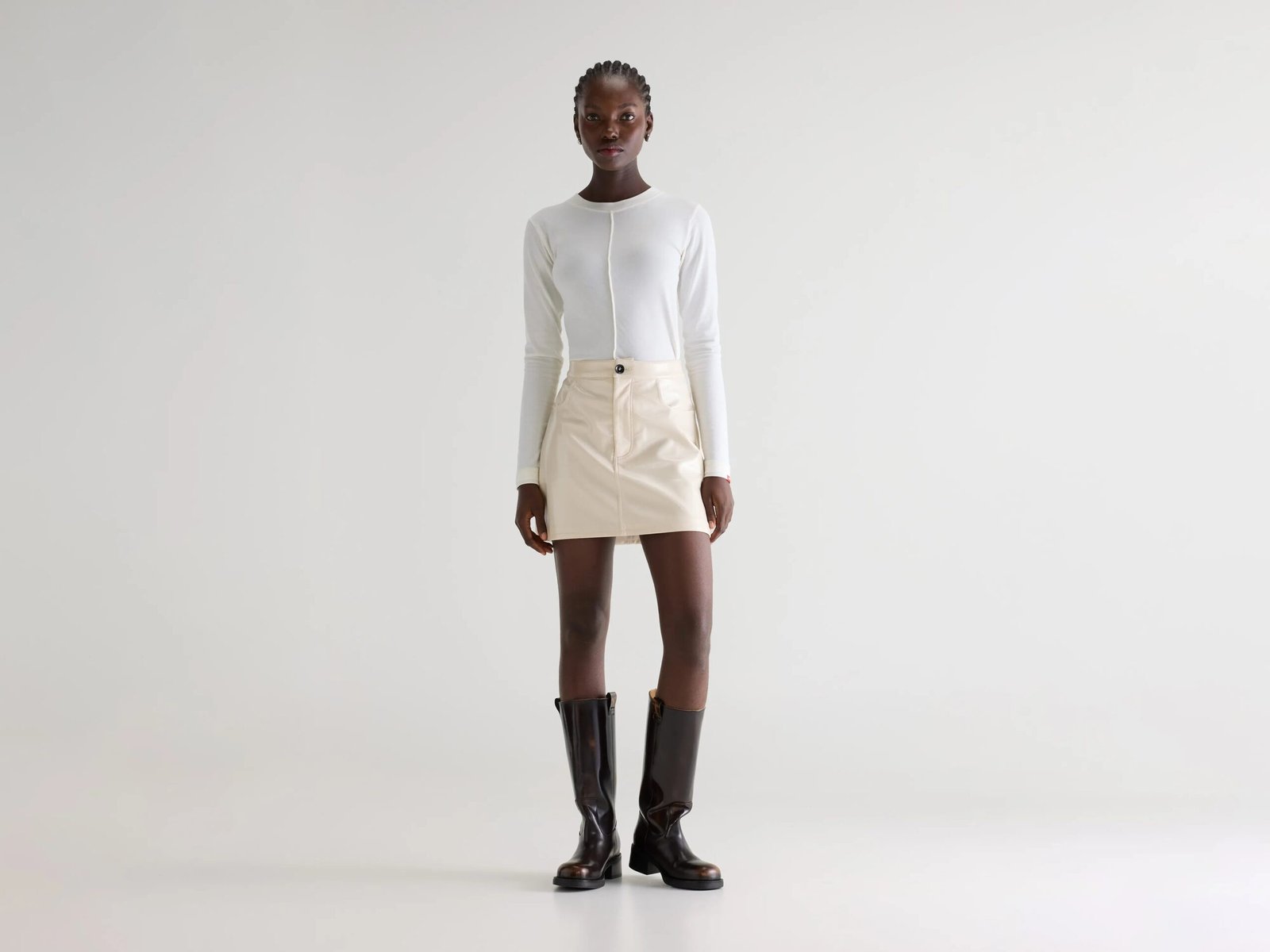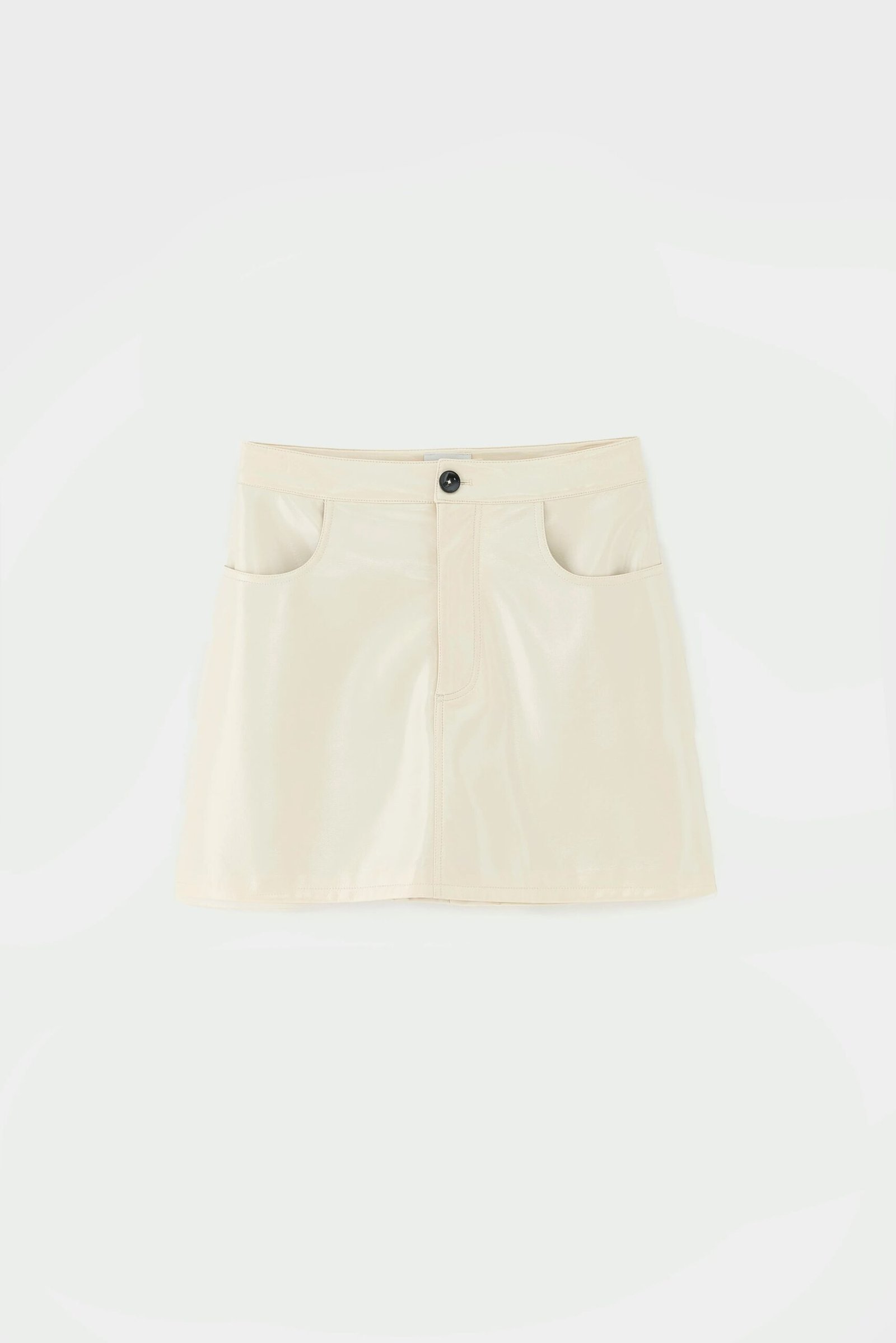 Faux-leather mini skirt with an A-line shape and 5-pocket style made from vinyl-like fabric in cream.