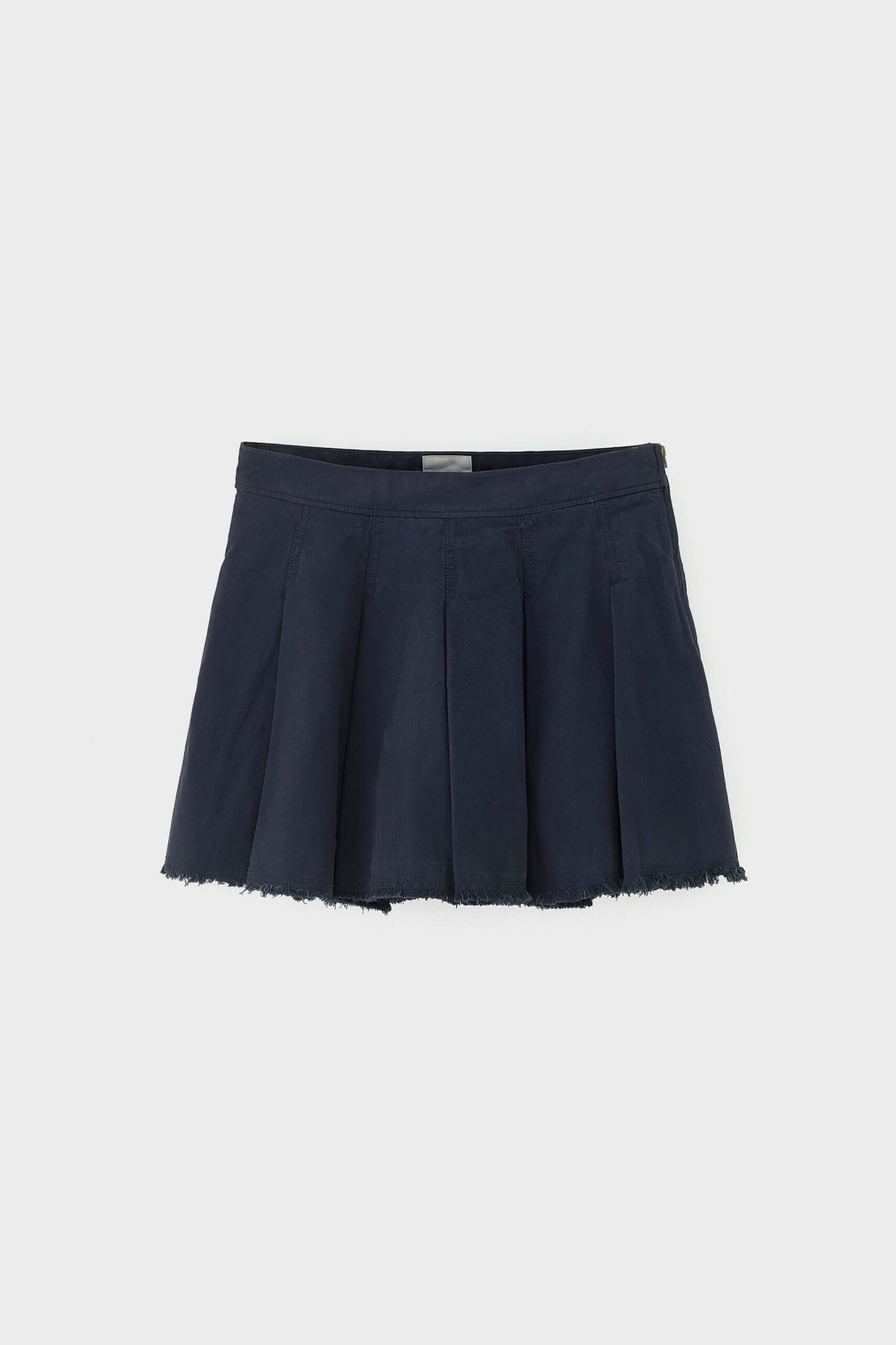 Pleated mini skirt in navy cotton with a flared silhouette. raw-cut hem. and side zipper closure.