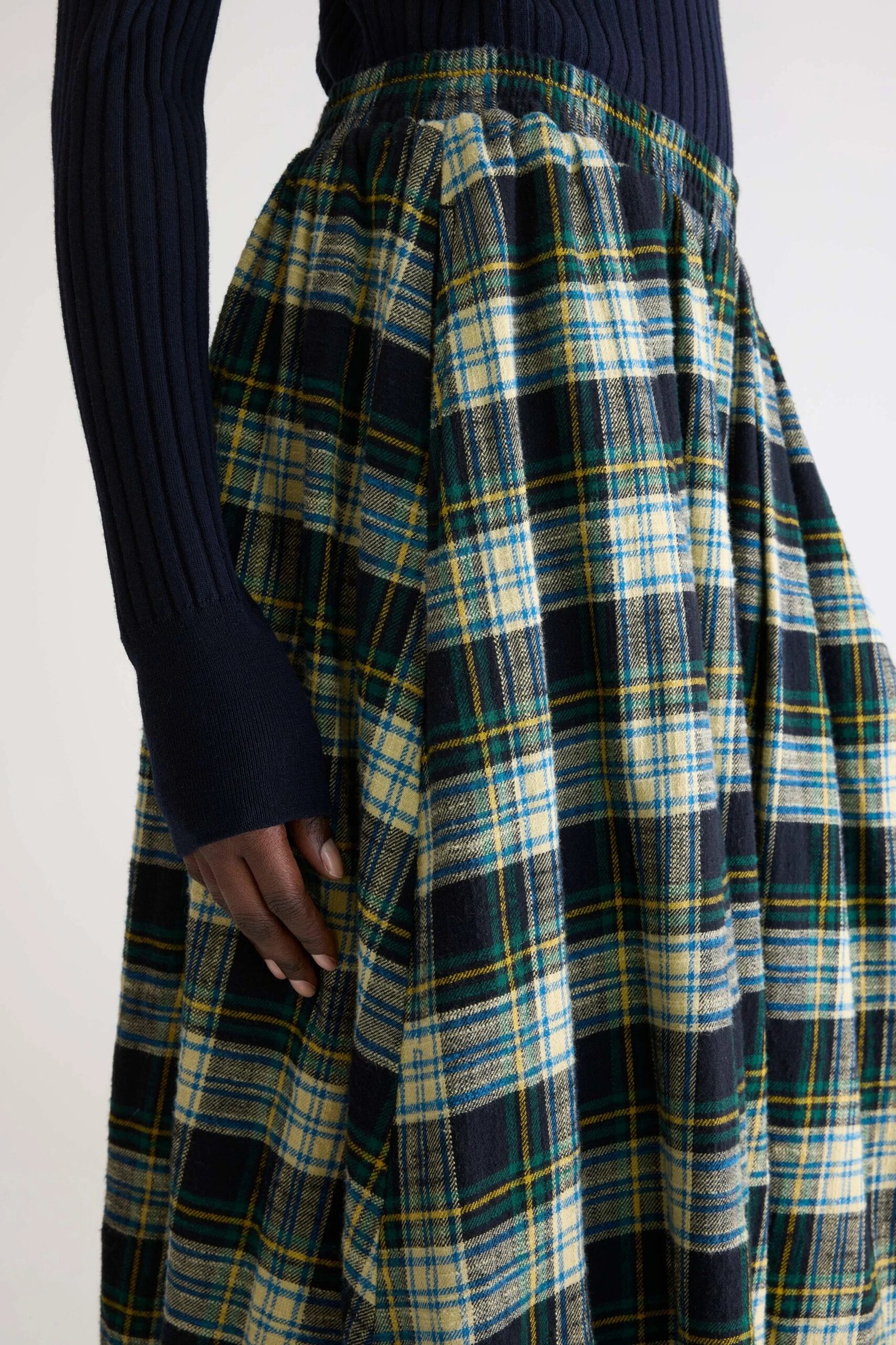 Tartan midi A-line skirt with a flowy silhouette. designed with a shirred elastic waistband for a comfortable fit.